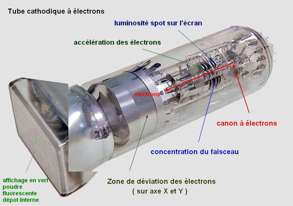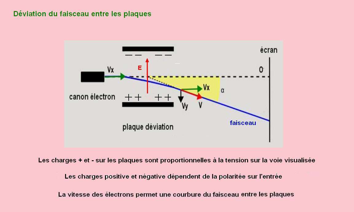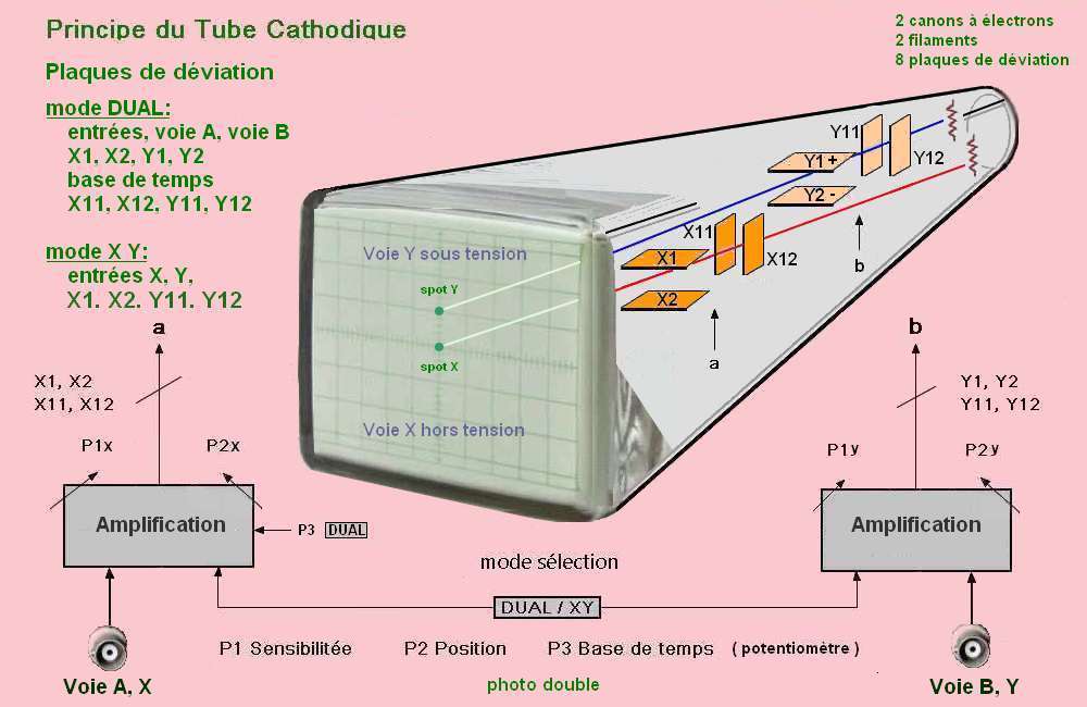 Le spot de trace se déplace de la gauche vers la droite à une vitesse dépendant du temps de balayage, il monte ou descent avec l'amplitude et la polarité de la tension sur l'entrée correspondante |