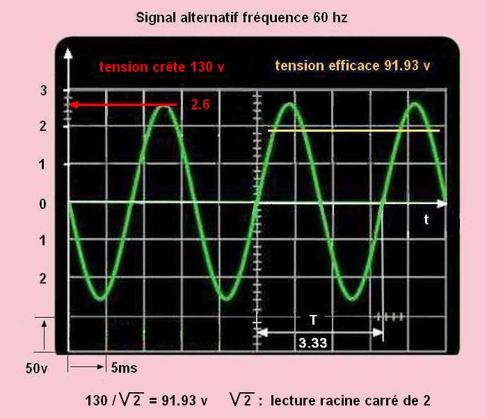 | t = temps en seconde ou milliseconde.......T = période signal = 3.33 * 5 = 16.65 ms = 0.01665 s ......fréquence = 1 / T = 1 / 0.01665 = 60 Hz |