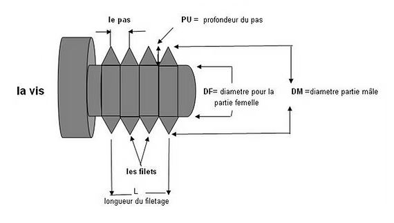 La désignation de la vis est M 4 (4 diamètre de la vis) en gros pas (pas 0,7 non donné), ou M 4 * 0,5 en pas fin (donné également M 4 * 500) |