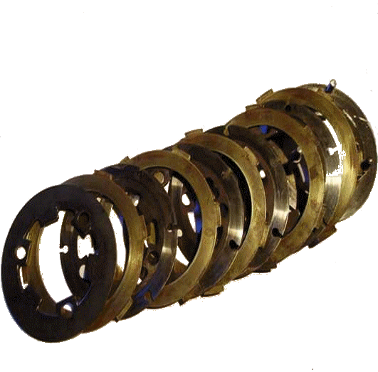 Disques d'embrayage, 5 de bronze en alternance avec 4 d'acier, premier plan 1 contreplaque acier,