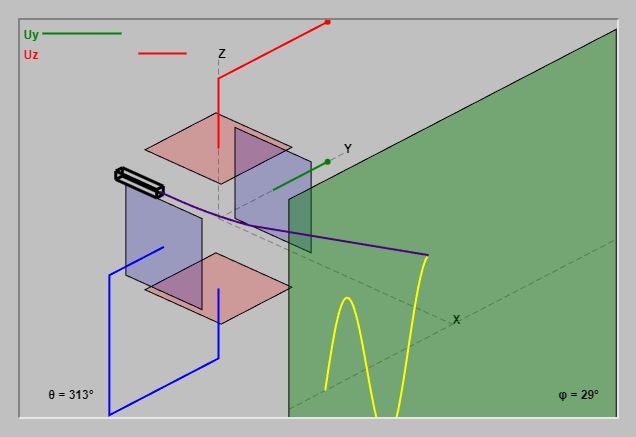 Le spot de trace se déplace de la gauche vers la droite à une vitesse dépendant du temps de balayage, il monte ou descent avec l'amplitude et la polarité de la tension sur l'entrée correspondante |