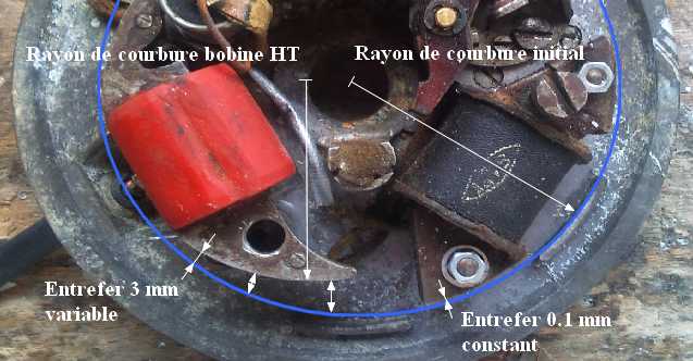 Un meulage du circuit magnétique de la bobine HT peut être réalisé pour un rayon de courbure trop grand, évaluer l'entrefer d'origine à 0.1 mm |