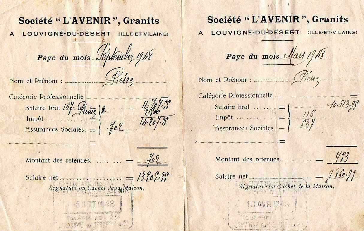 Deux bulletins de paie d'un ouvrier tailleur de pierre année 1948, le salaire est "au mètre linéaire taillé" |